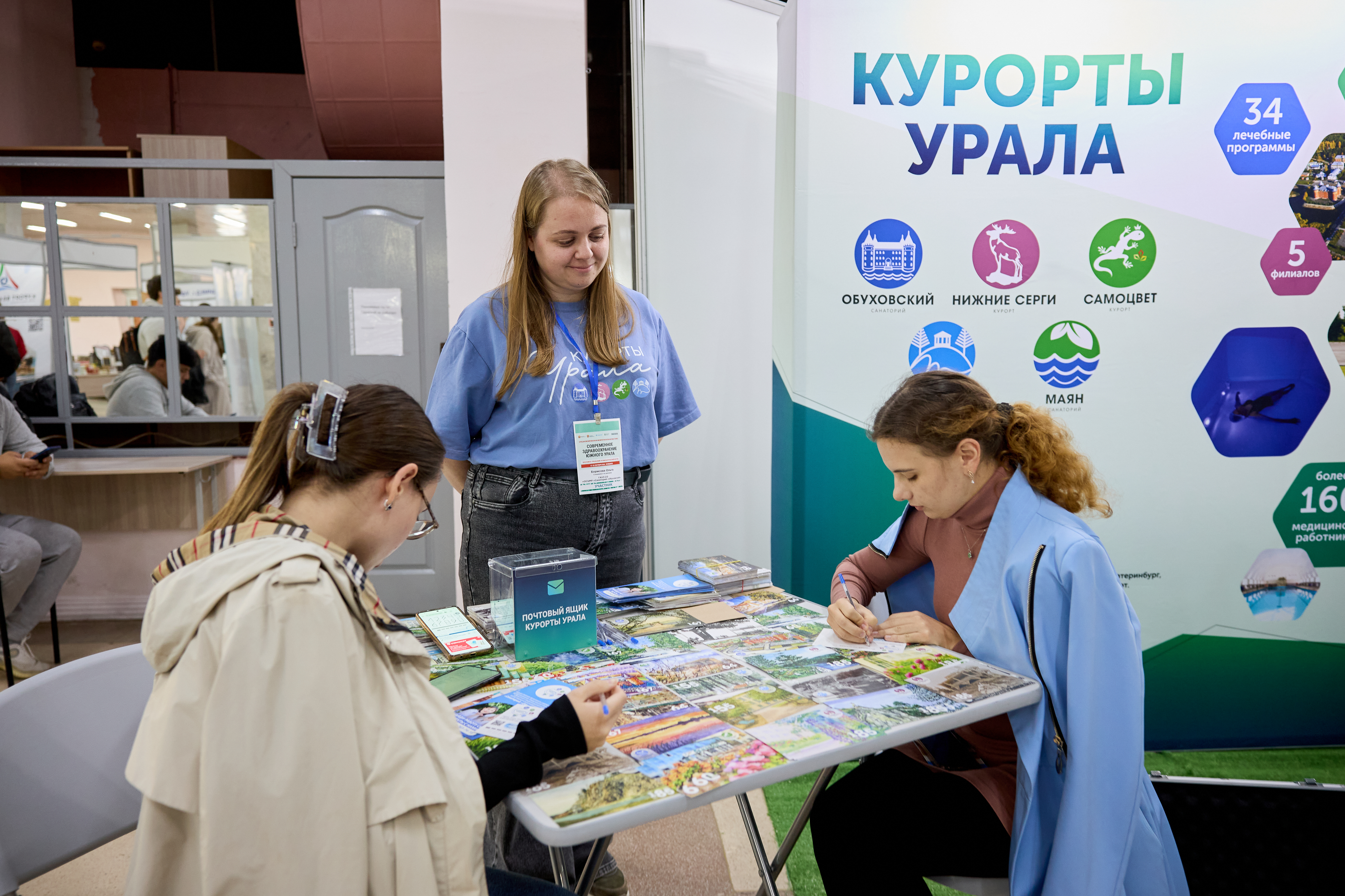 Представители «Курортов Урала» руководитель службы заботы о гостях Елена Задорожная и специалист по рекламе Ольга Борисова рассказывали об оздоровлении в наших санаториях «Обуховский», «Нижние Серги», «Самоцвет», «Маян», «Курьи», провели розыгрыш путёвки в санаторий «Самоцвет», представили на выставке лечебную сапропель озера Молтаево, предлагали гостям продегустировать минеральную воду «Обуховская» и «Нижнесергинская». Заинтересовала многих акция «Открытка»: гости могли подписать своим близким открытку с изображениями «Курортов Урала» и опустить её в настоящий почтовый ящик. Открытки полетят к адресатам из санатория «Обуховский».