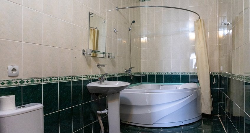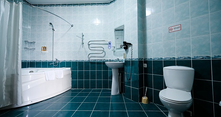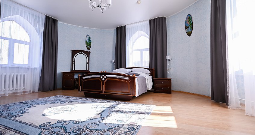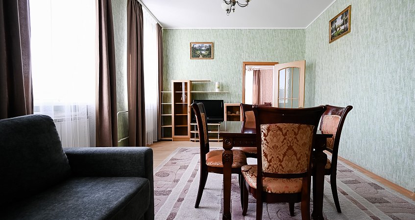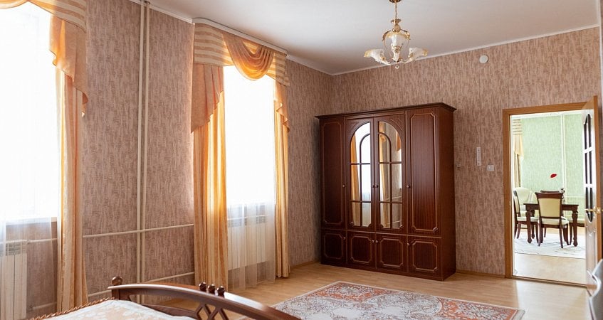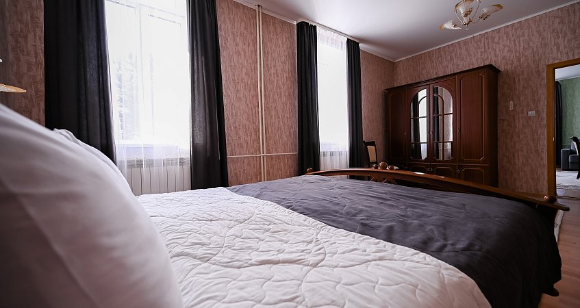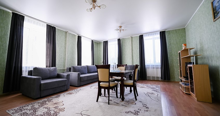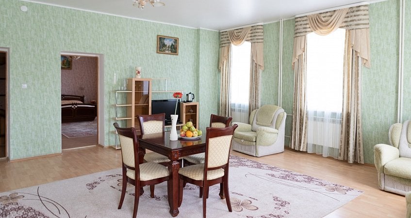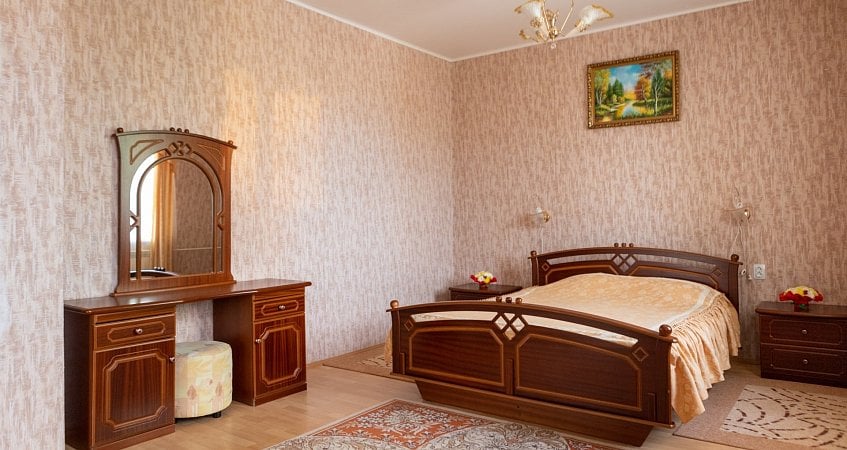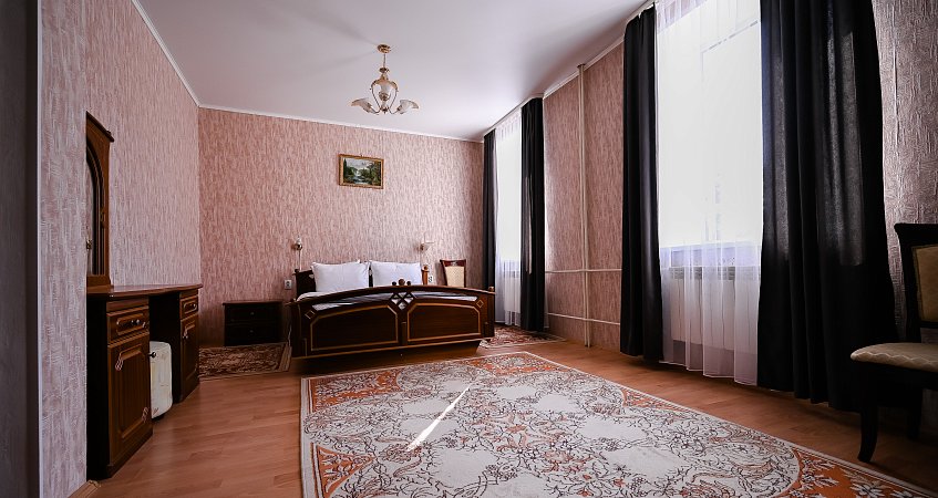 Номера Люкс площадью 50-60 кв.м. с одной спальней и большой гостиной, оснащены всей необходимой мебелью и бытовым оборудованием. Для санитарно-гигиенических удобств в номере: холодное и горячее водоснабжение.