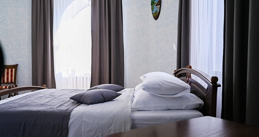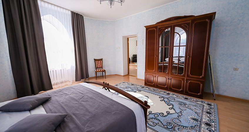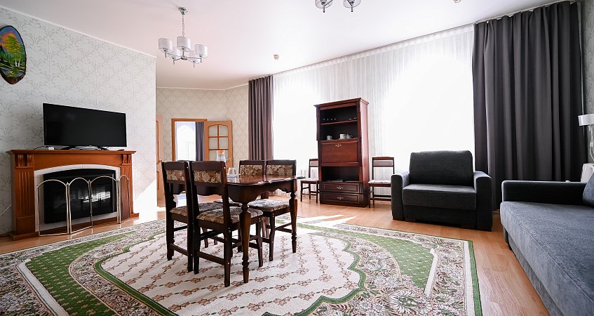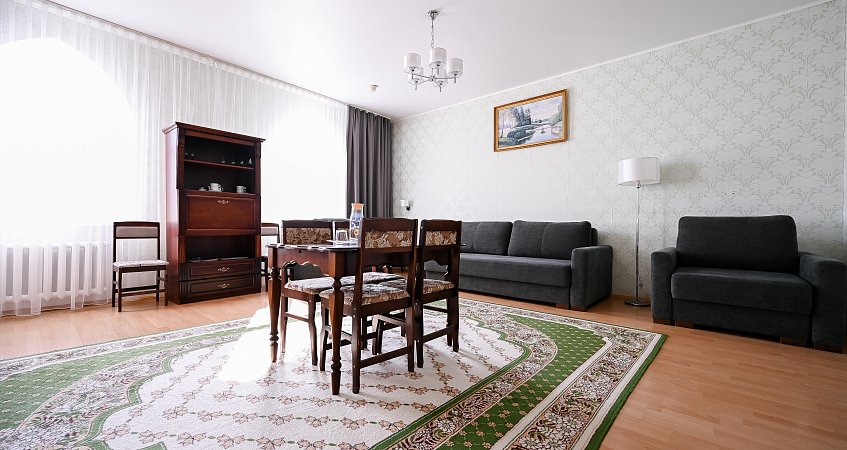 Номера Люкс площадью 50-60 кв.м. с одной спальней и большой гостиной, оснащены всей необходимой мебелью и бытовым оборудованием. Для санитарно-гигиенических удобств в номере: холодное и горячее водоснабжение.